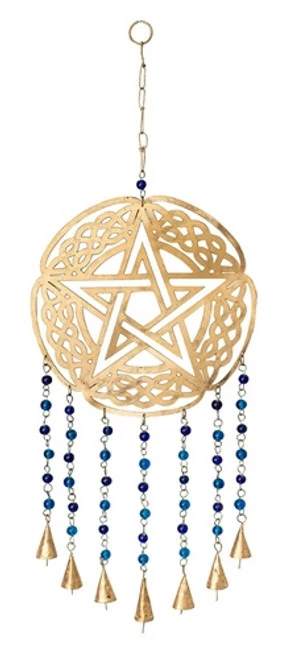 Delicate lazer cut metal with a celtic knot design featuring a pentagram and pretty blue beads.