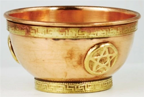 Beautifully sculpted from copper and highlighted with brass accents, this offering bowl has been bedecked with the ancient mystical symbol of the pentagram. Measuring approximately 7.5cm in diameter and a little over 3cm tall, it readily fits upon any altar and can be placed before any icon for you to place your sacred offerings during holidays, daily rituals, or ceremonial magick. Its polished copper surface also makes it easy to clean and ensures that it will be a lasting piece for your sacred space.
