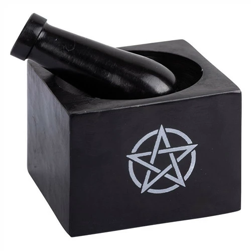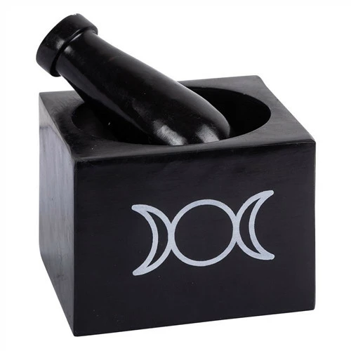 Soapstone pestle and mortar featuring either an engraved triple moon sigil or pentagram.