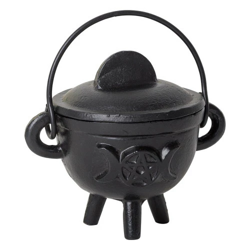 Crafted of finely wrought cast iron and decorated with a triple moon symbol, both on its front and on its back, this cauldron is a wonderful piece for decorating the home or altar. Standing a discrete 7.5 cm high and 5.5 in diameter, this cauldron presents an adorable image. Coming complete with a heavy, cast iron lid and a carrying handle, it makes a wonderful addition for those who do not have the space on their altar for larger cauldrons or for those who simply wish to decorate their home or desk with this cauldrons small but powerful presence.