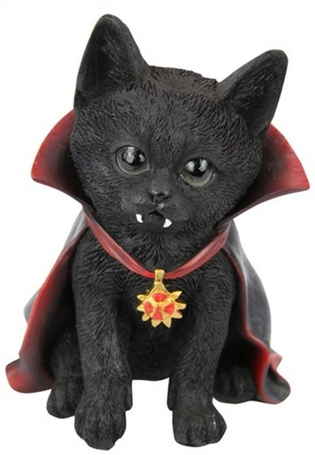 A statue with attitude – This Vampire Witch Cat has fangs, a red cape and medal. ..